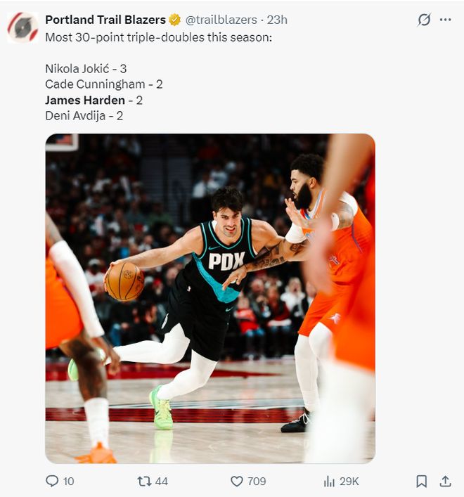 4.阿夫迪亚是开拓者队史首位两次30+15+10三双的球员;
